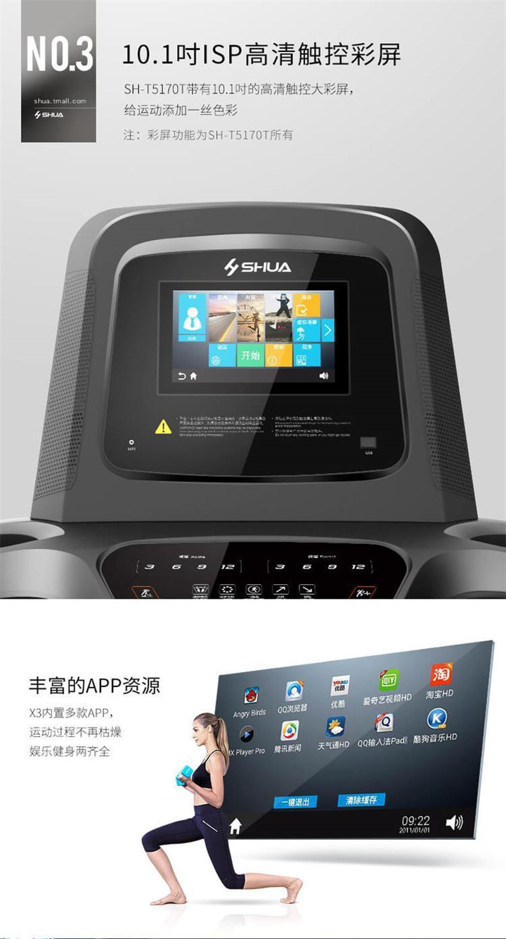 智能商用跑步機(jī)SH-T8919T-Y50(V1+)采用T2.2mm黑鉆紋(可選配:T2.4免維護(hù)跑帶)的跑帶,選用手握心率測試 自帶心率帶及增加心率控速(HRC)程序模塊測量心跳等數(shù)據(jù),跑步寬度達(dá)580mm,可承受180kg的使用者使用。