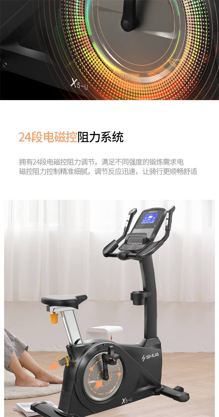 舒華立式健身車(chē)SH-6500U(X5-U)采用自發(fā)電,曲軸達3PCS,電控的阻力系統,設有24段阻力等級,擁有7.5kg的磁控輪。