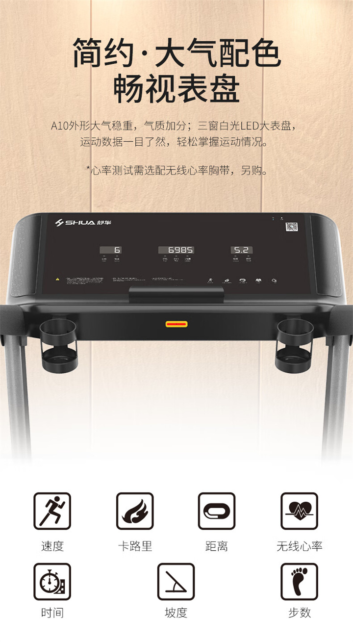 舒華家用跑步機SH-T5100持續馬力達1.25HP,具有500×1350mm的跑臺,運用無(wú)線(xiàn)心率接收模塊監測心率,運用6位硅膠減震設計,最大承重是126kg,可以滿(mǎn)足大多數家庭的使用。